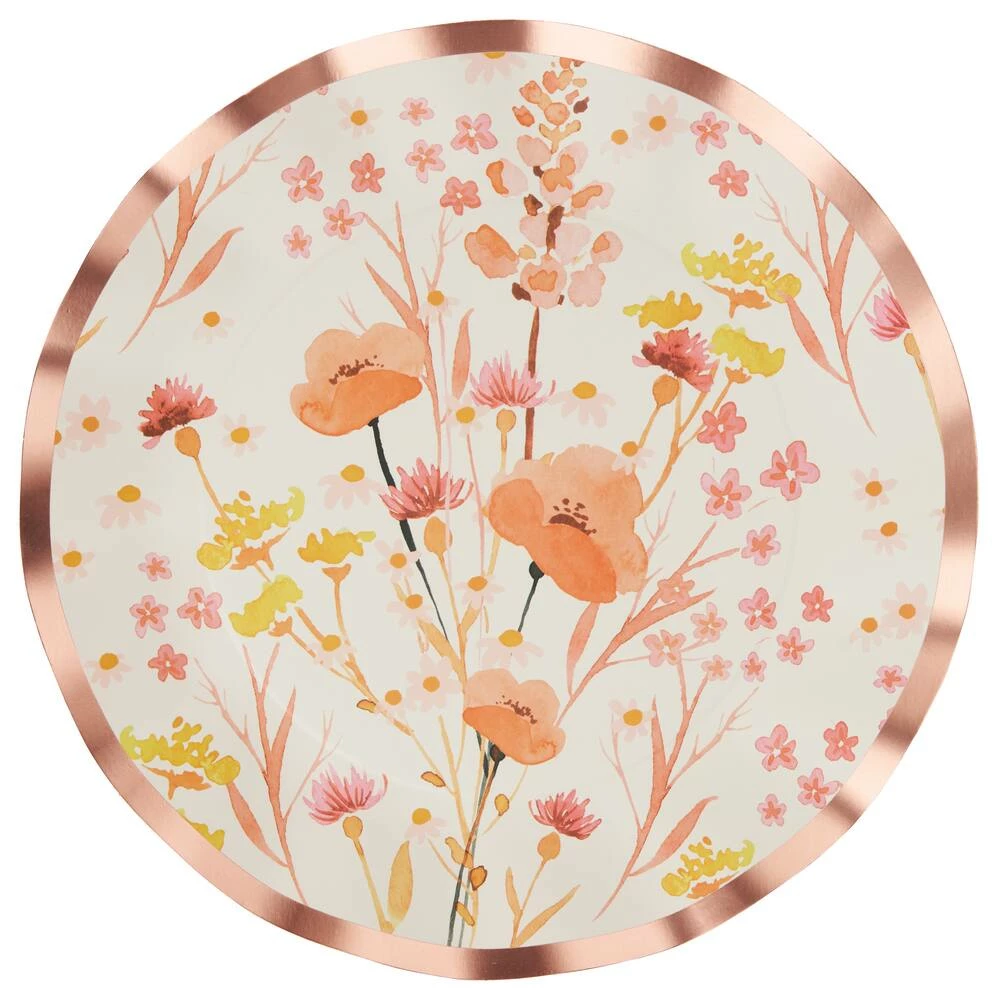 - Sophistiplate Wildflower Dinner Plates feature a fresh floral pattern trimmed in rose gold